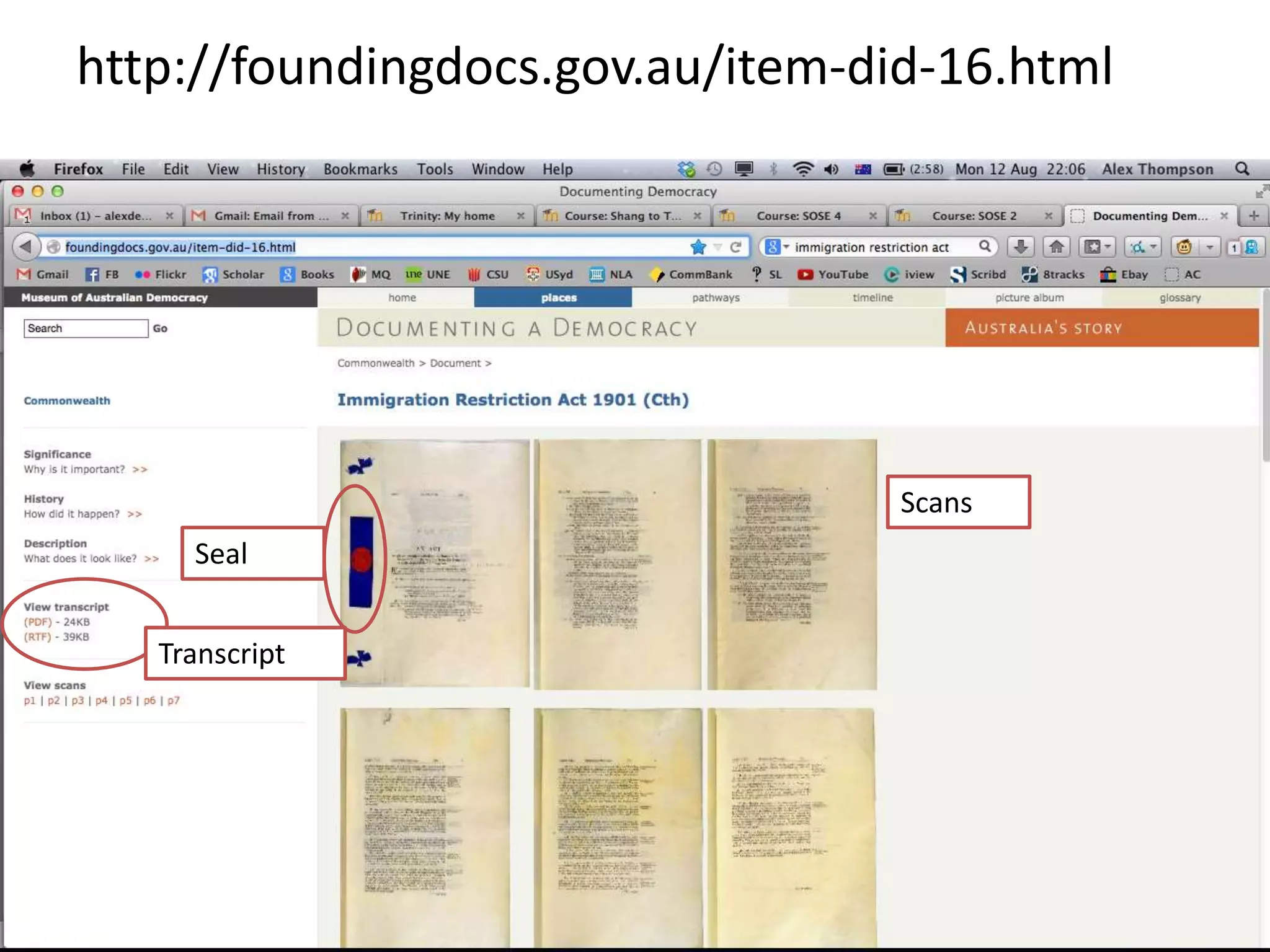 The document provides information about the Commonwealth of Australia's official seal, including a transcript and scans of the original seal. The seal depicts major symbols important to Australia's identity as a nation, including a shield, stars, and crown.