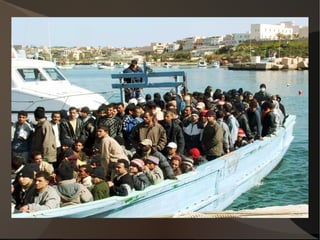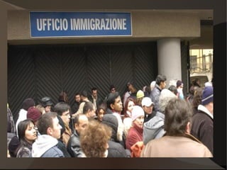 Il documento analizza la storia dell'immigrazione in Italia, evidenziando la transizione da paese di emigrazione a paese di immigrazione a partire dagli anni '70, con l'intensificarsi dei flussi migratori negli anni '80 e '90. Vengono citate leggi significative come quella del 1986 e la legge Bossi-Fini del 2002, che hanno contribuito a regolare i flussi e le condizioni degli immigrati. Oggi, il fenomeno dell'immigrazione in Italia è caratterizzato da una significativa presenza di stranieri, soprattutto provenienti da paesi come Romania, Marocco e Albania.