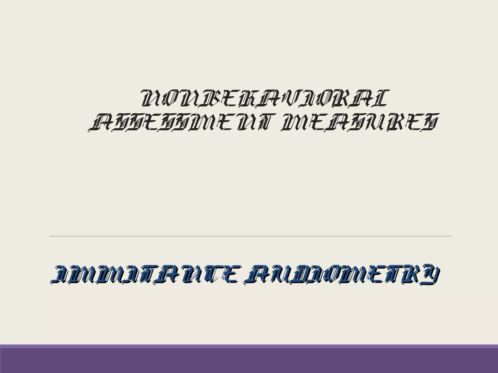 Immittance audiometry uses measurements of acoustic impedance and admittance to assess middle ear function. It is a non-invasive and non-behavioral test. Key measures include tympanometry to evaluate the mobility of the eardrum and ossicular chain, and acoustic reflex thresholds to assess the function of the middle ear muscles and brainstem pathways. Abnormal immittance test results can help diagnose conditions like middle ear fluid, ossicular discontinuity, or retrocochlear lesions.