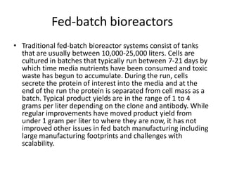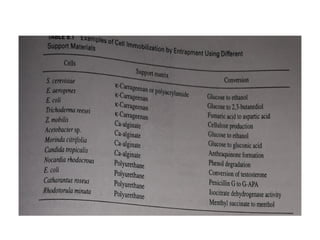 This document discusses different methods for immobilizing whole cells, including perfusion bioreactors and biofilm formation. Perfusion bioreactors culture cells continuously over long periods by feeding fresh media and removing waste, while various separation methods like hollow fiber membranes or centrifuges keep cells in the bioreactor. Perfusion offers advantages like improved product quality, smaller reactor size, and lower costs compared to traditional fed-batch systems. The document also covers immobilizing cells through entrapment in polymers, attachment to surfaces, or passive biofilm formation on supports.