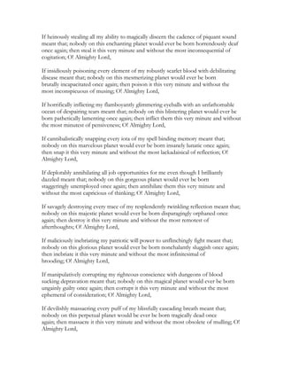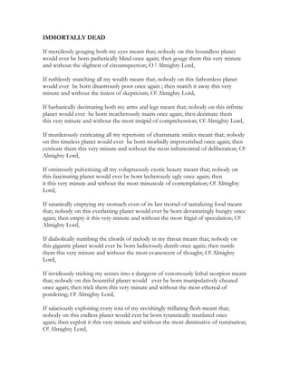 The document is a plea to God asking that if sacrificing various aspects of the speaker's life such as their eyes, wealth, limbs, etc. could prevent future suffering in the world, to take those things from them now. The speaker offers to give their entire life and body if it means no one else would have to experience poverty, disability, hunger, or other hardships again. They argue that extinguishing their single life could create countless more happy lives and bring lost joy to the world, so they would feel privileged to be "immortally dead."