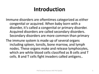 The document discusses the diagnostic approach to immune deficiency disorders. It describes how immune disorders can be congenital or acquired. The diagnostic process involves recognizing signs and symptoms of infection, performing laboratory tests of immune function, and considering alternative diagnoses. Specific primary immunodeficiency diseases are outlined, including their characteristic features. Secondary immunodeficiency disorders can result from other illnesses and conditions that weaken the immune system. A thorough diagnostic workup is necessary to determine the cause and guide treatment of immune deficiencies.