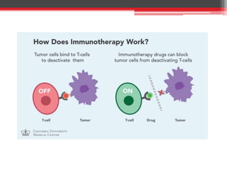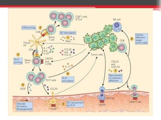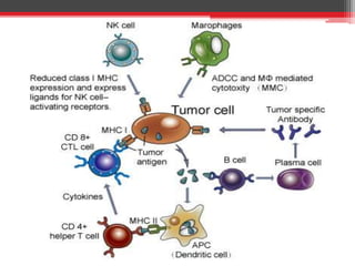 The immune response to tumors involves complex mechanisms wherein tumor cells evade detection and elimination by the immune system, leading to cancer progression. Despite the presence of tumor-associated antigens that can trigger an immune response, factors such as immune tolerance, suppressor cells, and tumor-induced inhibition significantly impair immune reactions. Immunotherapy aims to enhance the body's defense against cancer by utilizing various methods to restore or improve immune function.