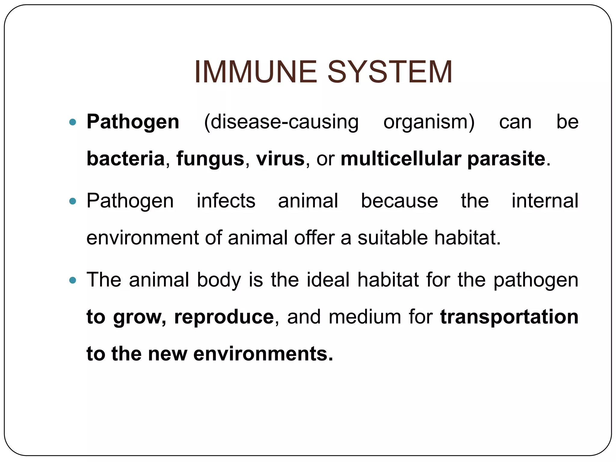 The document provides an overview of the immune system, detailing the mechanisms of both innate (nonspecific) and adaptive (specific) immunity, including cell types involved, their functions, and responses to pathogens. It covers components like phagocytic cells, natural killer cells, and antibody responses, as well as the inflammatory process and the role of antigens in triggering immune responses. Additionally, it discusses the diversity of antibodies and their classes, highlighting the importance of memory and specificity in the immune response.