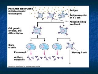 The immune system protects the body from pathogens and cancer cells. It contains nonspecific defenses that provide immediate protection and specific defenses that adapt over time. Nonspecific defenses include physical barriers and inflammatory responses, while specific defenses recognize and remember pathogens through B cells, T cells, antibodies, and memory cells. The document defines and compares these defenses.