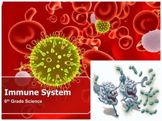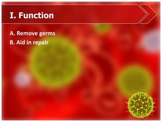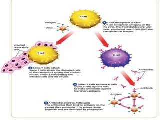 The immune system functions to remove germs and aid the body in repairing itself. It has barriers like the skin and respiratory system to prevent germs from entering. The non-specific immune response uses chemical signals, phagocytes, inflammation, and fever to attack any foreign substances. The specific response uses T-cells to recognize and destroy infected cells and B-cells to produce antibodies. Diseases like immunodeficiency, allergies, autoimmune disorders, and AIDS can damage the immune system or cause it to attack the body itself. Vaccination, antibiotics, and passive immunity from mother to child help prevent and treat infections.