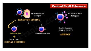 The document discusses immune tolerance, defining it as the immune system's unresponsiveness to antigens considered non-threatening, with self-tolerance and induced tolerance being key concepts. It covers the processes of central and peripheral tolerance mechanisms for T and B cells, including their development in relation to self-antigens and interactions with external antigens. Additionally, it explores how dendritic cells activate T cells under injury or infection conditions and outlines regulatory mechanisms that control T cell responses.
