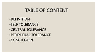 This document defines immune tolerance and describes its three main forms: central tolerance, peripheral tolerance, and self-tolerance. Central tolerance occurs as T cells develop in the thymus, where self-reactive cells are deleted. Peripheral tolerance maintains tolerance throughout the body via mechanisms like lack of costimulation and regulatory T cells. Self-tolerance is the normal lack of an immune response to self-antigens, and its breakdown can lead to autoimmune diseases.