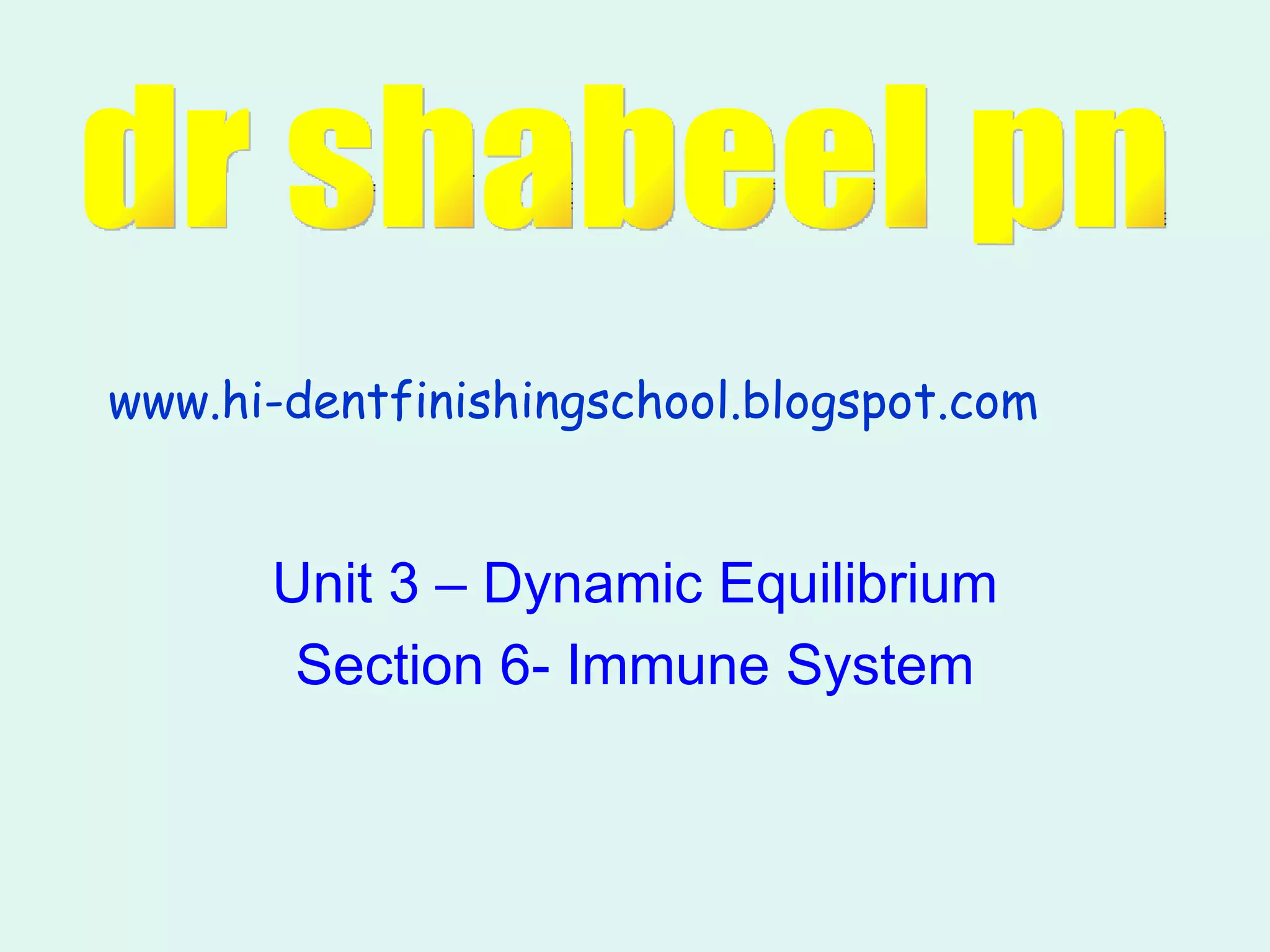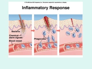 The document summarizes key concepts about the immune system. It describes the immune system as having three lines of defense against pathogens: physical and chemical barriers provided by the skin, nonspecific responses that fight any invader, and specific immune responses that produce antibodies against particular pathogens. It also explains the pathways of cellular and antibody immunity, differences between primary and secondary immune responses, and issues like allergies, autoimmune diseases, and cancer.