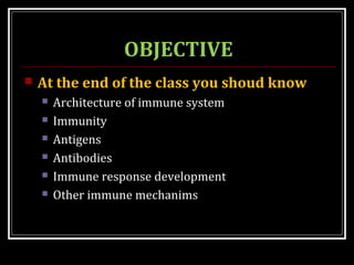 This document outlines a lecture on immunity and the immune system. It discusses the architecture of the immune system including the mononuclear phagocytic system and lymphoid components. It also covers topics like antigens, antibodies, immune response development, phagocytosis, cell-mediated immunity, humoral immunity, immunity, hypersensitivity, immunodeficiency diseases, and AIDS. The objective is for students to understand the key components and mechanisms of the immune system.