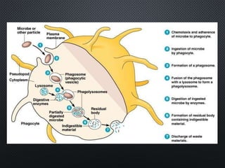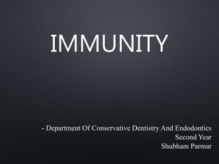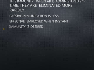 This document discusses innate and acquired immunity. Innate immunity is inborn and provides non-specific resistance to pathogens. It includes barriers like skin and mucous membranes, antimicrobial substances, and phagocytic cells. Acquired immunity develops from exposure to pathogens and results in long-lasting, pathogen-specific protection. It can be active, arising from natural infection or artificial vaccination, or passive, through transfer of antibodies from mother to fetus or through administration of antisera.