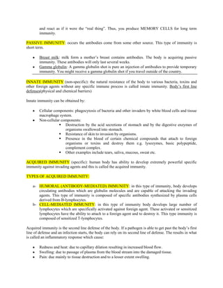The document discusses immunity and the immune system. It defines immunity as the body's ability to resist harmful organisms and toxins. The immune system is composed of specialized cells that fight pathogens like bacteria, viruses, fungi and protozoa. The immune system produces antibodies and cells that can deactivate pathogens. Immunity can be active, acquired after infection or vaccination, or passive, acquired from external sources like breast milk or gamma globulin injections. The document also describes innate immunity, the body's first line of defense, and acquired immunity, the second line of defense involving lymphocytes and lymphoid tissues.