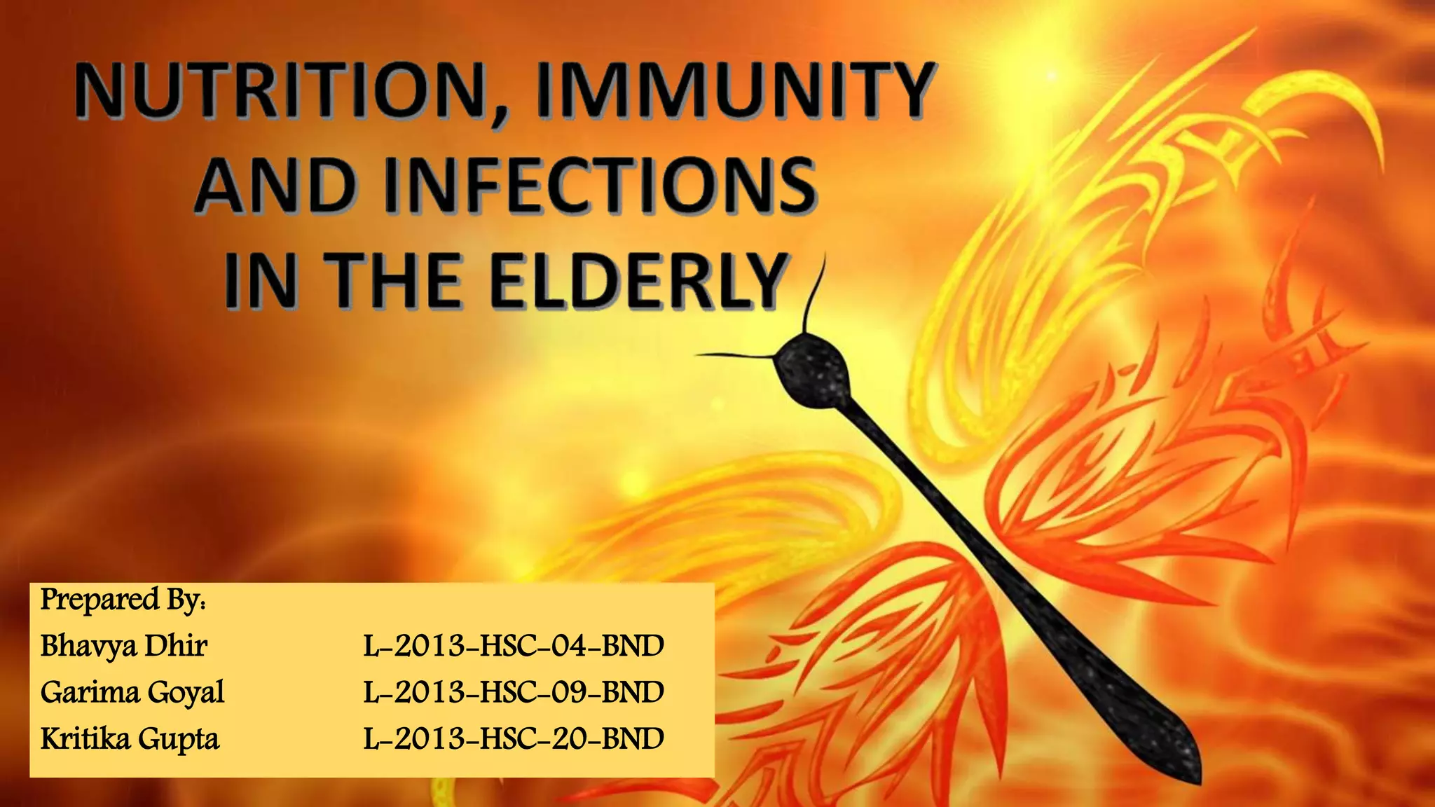The document discusses the effects of aging on nutrition and immunity. It notes that the proportion of elderly individuals is rising globally and aging is associated with increased illness and health costs. Primary aging immune deficiency refers to normal immune changes seen in healthy elderly individuals. Key immune changes include reductions in T-lymphocytes and cell-mediated immunity as well as alterations in cytokine secretions. Nutritional status is affected by physiological, physical, psychological, social, economic and cultural factors in older adults. Common nutritional deficiencies include vitamins and minerals. Physiological changes like reduced digestion and senses can impair nutrition. Maintaining good nutrition is important for quality of life in the elderly.
