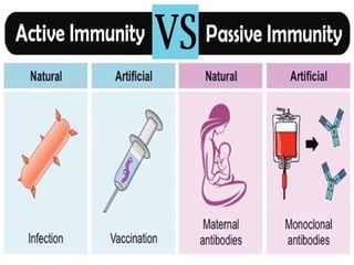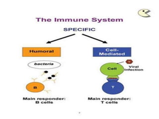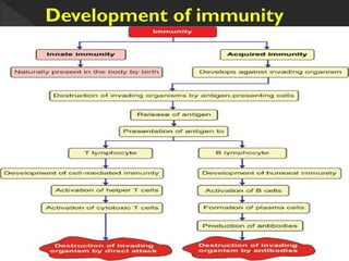 The document provides an overview of the immune system, detailing various types of immunity including natural and acquired immunity, and their mechanisms of action against foreign substances like bacteria and viruses. It explains the roles of antibodies, antigens, and different types of cells involved in both humoral and cell-mediated immune responses. Additionally, the document discusses the concept of herd immunity and its significance in protecting populations from diseases.