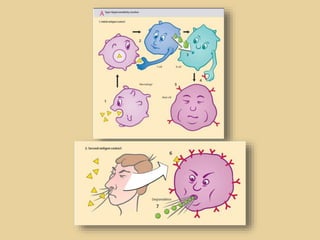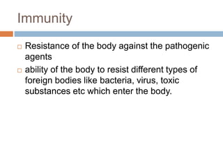 Immunity involves the body's resistance to pathogenic agents. It is broadly divided into innate and acquired immunity. Innate immunity is present from birth while acquired immunity develops after exposure to specific pathogens. Immunization helps prepare the body against diseases either through passive or active immunity. Immunodeficiency diseases are caused by inherited or secondary defects in immunity. Acquired Immunodeficiency Syndrome is caused by HIV and damages the immune system. Hypersensitivity reactions occur when the immune system overreacts to antigens and are classified into four types based on the mechanisms involved.