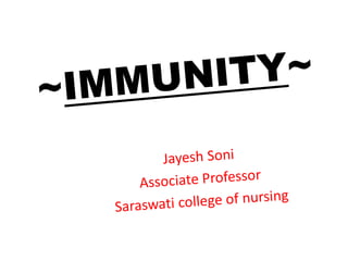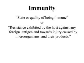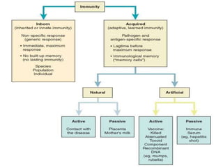 This document discusses different types of immunity. It describes innate immunity as resistance at birth through epithelial surfaces, antibacterial substances, cellular factors, inflammation, fever and acute phase proteins. Acquired immunity develops during life and is either active (adaptive) through natural infection/vaccination or passive through natural transfer or immunization with antibodies. Active immunity is long-lasting while passive is short-term. Innate provides initial defense while acquired immunity provides adaptive response.