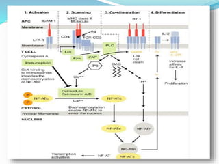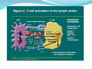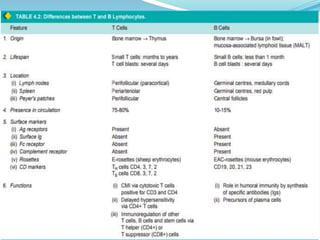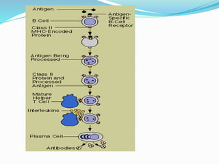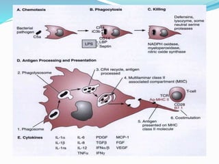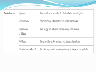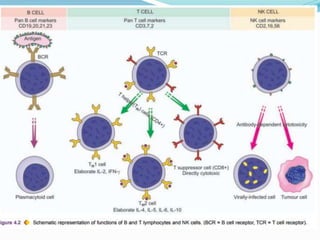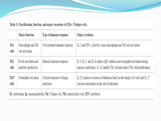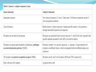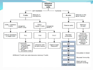 This document provides an overview of the immune system. It begins with definitions of immunity and the historical views of disease. It then describes the innate and adaptive immune systems in detail. The innate system includes physical barriers and the complement system. Adaptive immunity involves both humoral immunity through B cells and antibodies, and cell-mediated immunity through T cell subsets. Key immune cells like macrophages and neutrophils are also summarized in terms of their functions, including phagocytosis, antigen presentation, and cytokine secretion. The document provides an extensive but concise review of immune system components and their roles in protection from pathogens.
