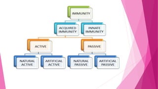 This document defines and compares innate and acquired immunity. Innate immunity is present from birth and provides non-specific resistance to pathogens. It involves anatomical barriers, inflammatory responses, complement pathways, and cytokines. Acquired immunity develops during a person's lifetime through active or passive transfer of antibodies or immune cells. Active immunity results from infection or vaccination and is long-lasting, while passive immunity provides short-term protection through antibody transfer from mother to fetus or through immunoglobulin treatments.