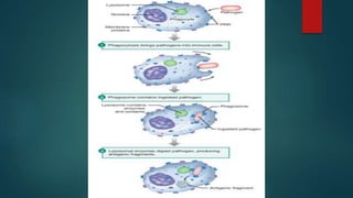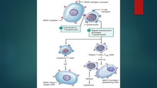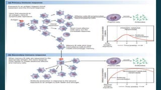 The document discusses immunity and the immune system. It describes two types of immunity: innate immunity, which provides natural resistance without specificity, and acquired immunity, which develops specific responses. The major components of the immune system are described, including antigens, antibodies, lymphocytes, macrophages, and natural killer cells. Both humoral and cell-mediated immunity are discussed. Effects of immune deficiency are also summarized.