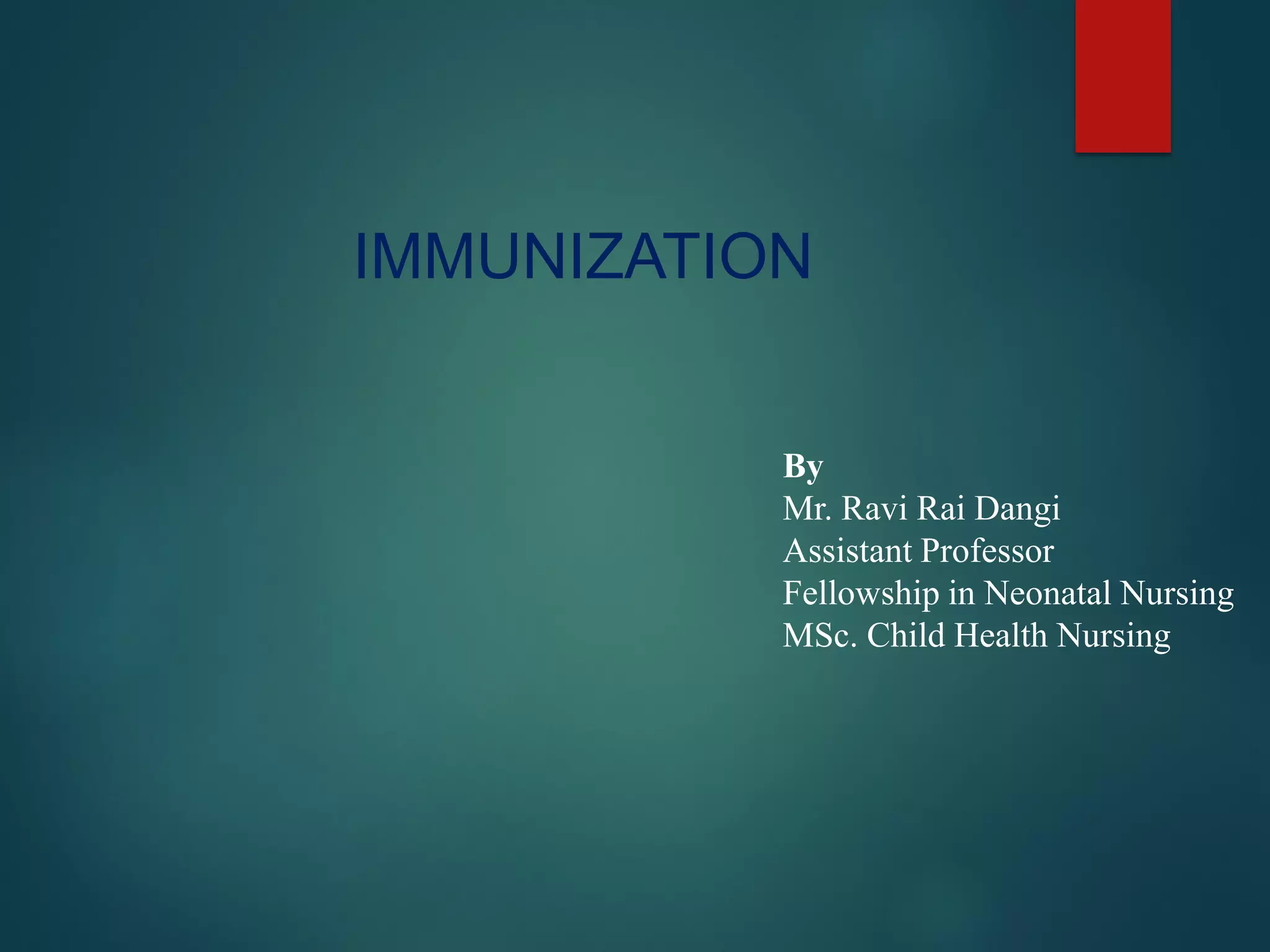 The document provides a comprehensive overview of immunization, detailing the definitions, types (active and passive), historical developments, and achievements in vaccination efforts. It outlines the national immunization schedule, types of vaccines administered at specific ages, and their contraindications and side effects. Additionally, it emphasizes the importance of maintaining a cold chain for vaccine storage and administration, along with guidelines for future immunization practices.