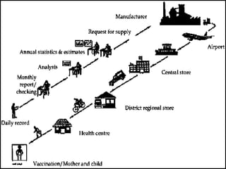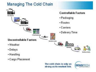 2. The cold chain is described as the system used to transport and store vaccines within recommended temperature ranges from manufacture to point of use. Proper storage and transport using equipment like walk-in cold rooms, deep freezers, and ice-lined refrigerators is important to maintain vaccine potency.