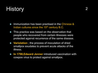 The document provides a comprehensive overview of immunization, detailing its history, definitions, types of vaccines, and their mechanisms of action. It also discusses the importance of vaccines in preventing diseases, the cold chain necessary for vaccine storage, and potential hazards associated with immunization. Additionally, it emphasizes the need for precautions during vaccine administration and outlines recommendations for specific populations such as healthcare workers and pregnant women.
