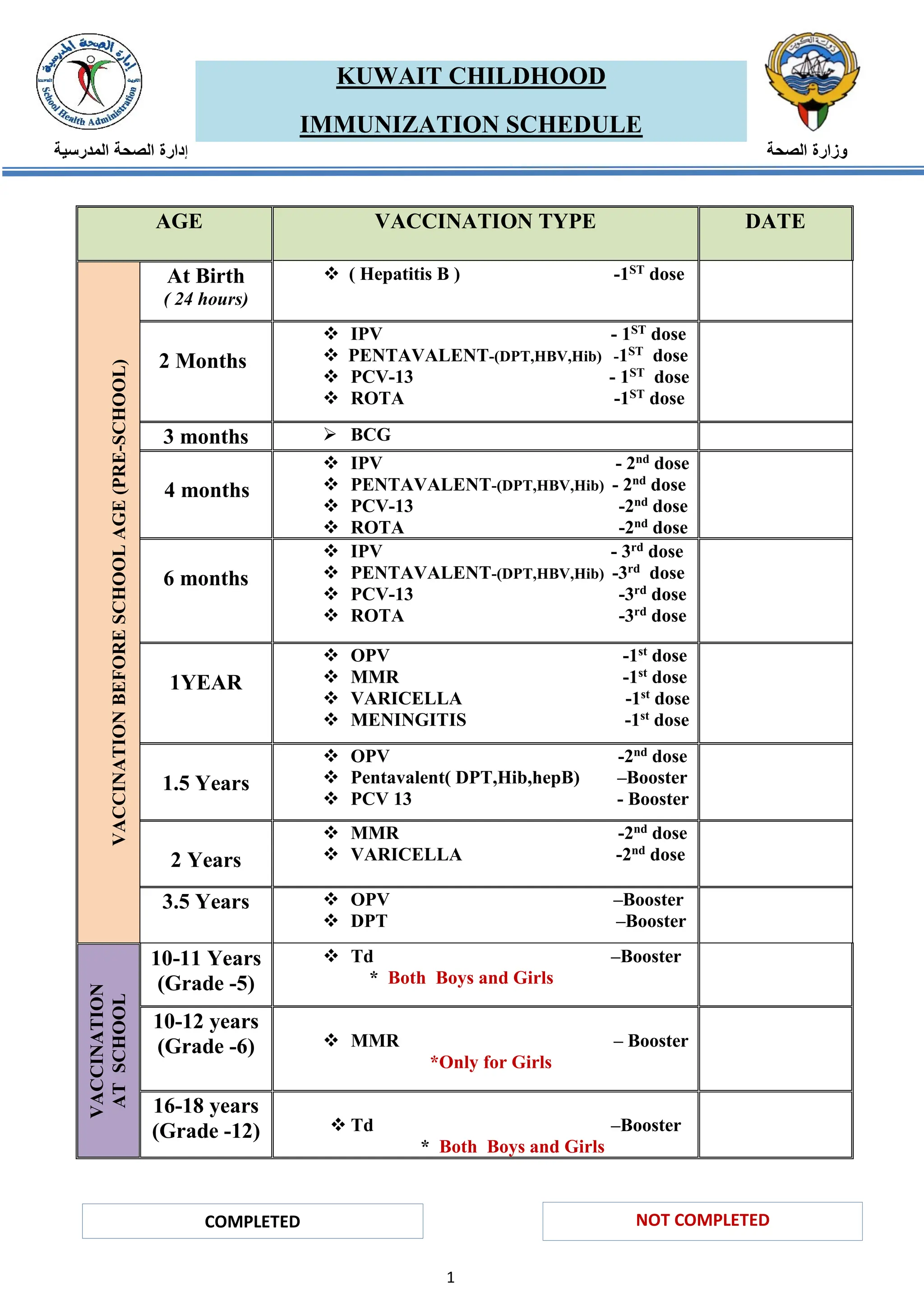 تحتوي الوثيقة على جدول تطعيمات الأطفال في الكويت، يحدد أنواع التطعيمات وأعمار الأطفال التي يتوجب عليهم تلقيها. يشمل الجدول تطعيمات مختلفة مثل التهاب الكبد، السعال الديكي، والحصبة، ويتضمن الجرعات الأساسية والجرعات المنشطة. يهدف هذا البرنامج لضمان صحة الأطفال قبل دخولهم المدرسة.