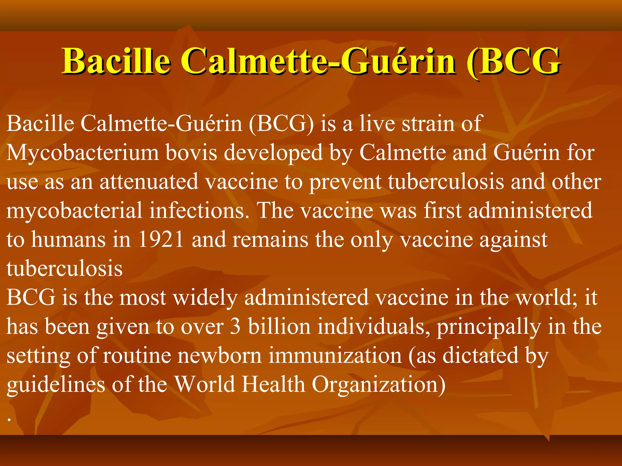 The document discusses several vaccines including BCG, DTP, polio, Hib, MMR, rotavirus, varicella, hepatitis A, and pneumococcal. It provides information on the nature of the vaccines, indications for use, efficacy, administration schedule and route, storage requirements, adverse reactions and contraindications. Specific details are given for dosage, intervals between doses, age for administration and booster schedules for many of the vaccines.