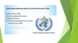 This document discusses immunization and vaccination. It defines immunization as rendering the subject immune by inoculating with a specific antigen to induce an immune response. It describes two types of immunity: active immunity produced by vaccines/toxoids that is long-lasting, and passive immunity produced by immunoglobulins that only provides temporary protection. It also discusses herd immunity and how a critical level of community immunity through vaccination protects even non-vaccinated individuals. The document outlines the expanded program on immunization in India and the vaccination schedule, describing various live attenuated, killed, and genetically engineered vaccine types for bacterial and viral diseases. It notes contraindications and potential adverse effects.