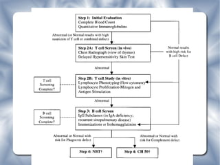 Il documento tratta delle immunodeficienze primitive, evidenziando le cause genetiche, i meccanismi immunologici e le manifestazioni cliniche associate a tali disordini. Viene spiegata la distinzione tra immunità innata e adattativa, analizzando i difetti specifici e le loro conseguenze, come l'aumento della suscettibilità a infezioni e malattie autoimmuni. Infine, vengono descritte le diverse tipologie di immunodeficienze primarie e i criteri diagnostici per le più comuni.