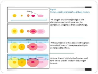 Immunoelectrophoresis is a technique that combines electrophoresis and immunodiffusion to separate and identify antigen components in a mixture. It involves applying an electric current to separate antigens in agar gel wells, then allowing the antigens to diffuse and react with antibodies placed in troughs cut into the gel. This results in the formation of precipitin lines that indicate reactions between individual antigens and antibodies, allowing different antigens to be identified based on the lines' position and shape. Immunoelectrophoresis is used in medical diagnostics to detect abnormal proteins and monitor antigen purity.