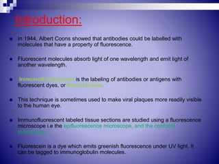 Immunofluorescence is a technique developed in 1944 that labels antibodies with fluorescent dyes to visualize antigens under a fluorescence microscope. The process employs light of specific wavelengths to excite fluorochromes like fluorescein and rhodamine, which emit light of longer wavelengths. Applications include direct and indirect immunofluorescence for disease diagnosis and flow cytometry (FACS) for cell sorting and analysis.