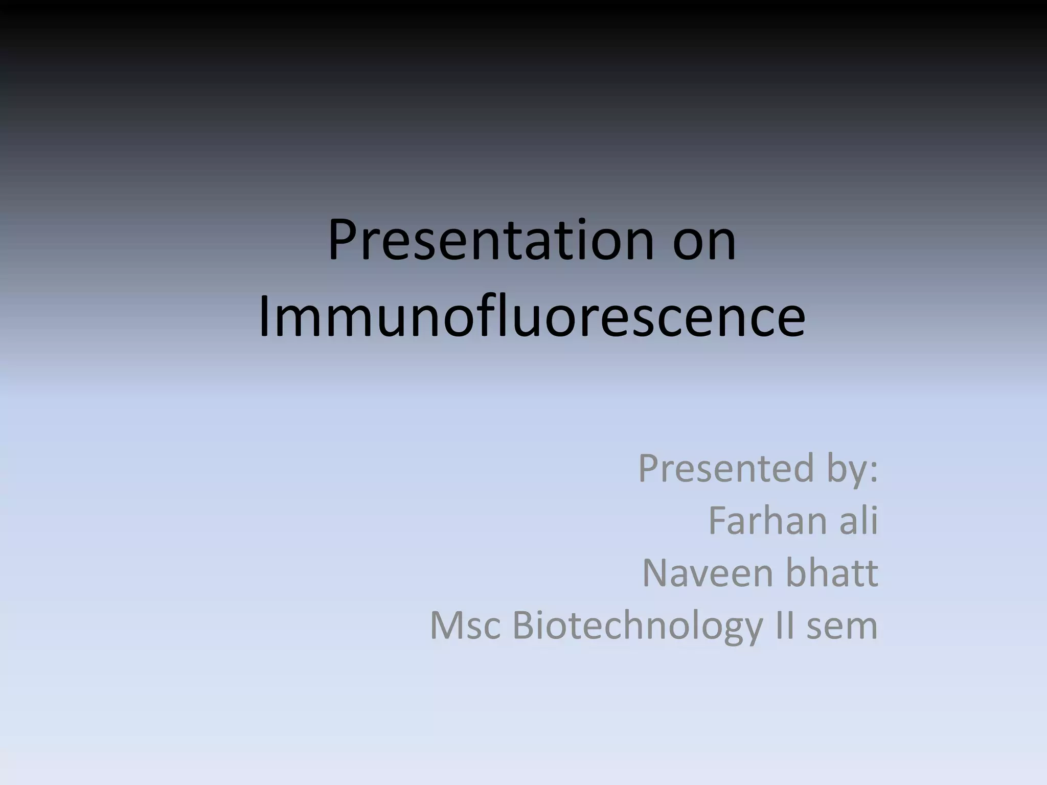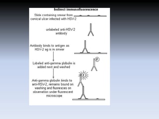 This presentation discusses immunofluorescence techniques. Immunofluorescence involves tagging antibodies with fluorescent dyes so that antigen-antibody complexes can be visualized under a fluorescent microscope. It describes the history and principles of direct and indirect immunofluorescence. Direct immunofluorescence detects in vivo antibodies bound to tissue antigens, while indirect immunofluorescence detects antibodies in patient serum. Both techniques have advantages like sensitivity but also disadvantages like potential cross-reactivity.