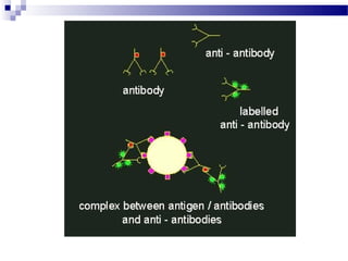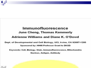 The document discusses immunofluorescence, a technique that uses fluorescent-labeled antibodies to detect specific antigens in tissues, viewed under a fluorescence microscope. It outlines the principles of direct and indirect immunofluorescence methods and their applications in clinical diagnoses, notably for skin diseases. Limitations include factors like antibody quality and specimen handling that can affect fluorescence signals.
