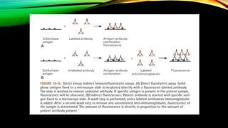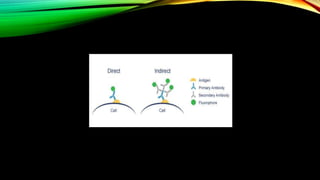 Immunofluorescence is a technique that uses the binding of antibodies to antigens to detect the presence of substances. It relies on tagging antibodies with fluorescent dyes called fluorophores. When exposed to ultraviolet light, the fluorophore-tagged antibody complexes emit visible light that can be seen using a fluorescent microscope. There are several types of immunofluorescence assays including direct, indirect, and quantitative assays that are used to detect microorganisms, antibodies, and other biomolecules through the antigen-antibody reaction and fluorescent signal produced.