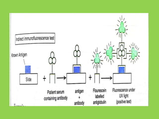 This document discusses immunofluorescence assays. It describes that immunofluorescence uses fluorescent dyes to detect the location of antigens or antibodies in tissue samples. There are two main types of immunofluorescence tests: direct and indirect. Direct tests use fluorescently-labeled antibodies to detect unknown antigens. Indirect tests detect antibodies in samples like serum by using a known antigen on a slide and fluorescently-labeled antibodies that bind to any human antibodies. The indirect test has the advantage of only requiring a single fluorescent conjugate that can detect antibodies to any antigen due to binding to all human antibodies.