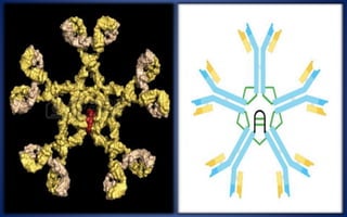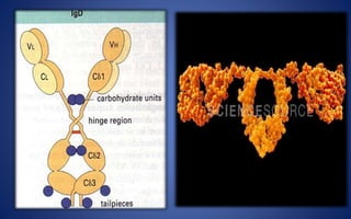 This document discusses immunoglobulins (antibodies), including their five classes (IgG, IgM, IgA, IgE, IgD), structure, functions, and production. The key points are: