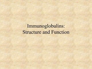 Immunoglobulins are glycoprotein molecules produced by plasma cells that function as antibodies in response to immunogens, exhibiting various structural features including heavy and light chains. They play key roles in immune responses, including complement fixation and binding to cells, with different classes (IgG, IgM, IgA, IgD, IgE) having unique structures and functions. The document also details the variable and constant regions, subclasses, and specific binding sites of immunoglobulins.