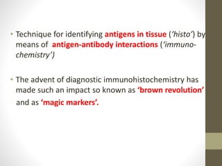 Immunohistochemistry is a technique used to identify antigens in tissue samples using antigen-antibody interactions. It has made a large impact in disease diagnosis since its development in the 1940s-1970s. The technique involves using labeled antibodies that specifically bind to antigens in tissue sections. This binding is then visualized using markers like enzymes or fluorescent dyes. Several methods have been developed to increase the signal and reduce background noise, including indirect labeling techniques and polymer-based methods. Proper tissue processing and antibody selection are important for obtaining high quality results with immunohistochemistry.