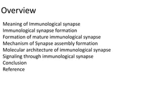 The immunological synapse is a specialized signaling structure formed at the interface between T lymphocytes and antigen presenting cells. It consists of three main components: T cell receptors, adhesion molecules, and co-stimulatory molecules. Formation of the mature immunological synapse involves molecular redistribution through diffusion and cytoskeletal movement over 5-30 minutes, resulting in a structure with central, peripheral, and distal supramolecular activation clusters that facilitate T cell signaling and activation. This signaling activates transcription factors that induce cytokine gene expression and T cell effector functions.