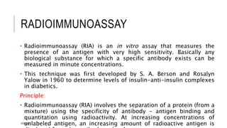 This document provides an overview of various immunological techniques including radioimmunoassay (RIA), rocket electroimmunodiffusion, chemical immunofluorescence, enzyme-linked immunosorbent assay (ELISA), and allergen testing. It describes the basic principles, methodologies, applications, advantages, and disadvantages of each technique. Radioisotopes commonly used in RIA and the steps of the RIA methodology are detailed. The document also discusses specific chemiluminescent compounds, types of ELISAs, and in vivo and in vitro allergen testing methods.