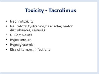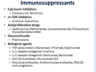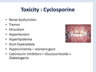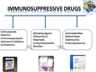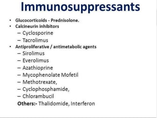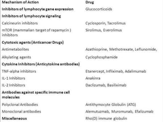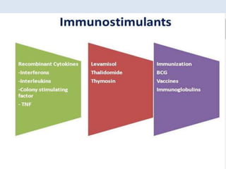 The document discusses various immunomodulators and their roles in the immune system, detailing types of immunity, therapeutic uses, and adverse effects. It highlights the functions of cytokines, immunostimulants, glucocorticoids, calcineurin inhibitors, anti-TNF agents, and other immunomodulating drugs in treating diseases such as cancer, autoimmune disorders, and transplant rejection. Additionally, it explains the mechanisms of action of these agents and their implications for patient care.