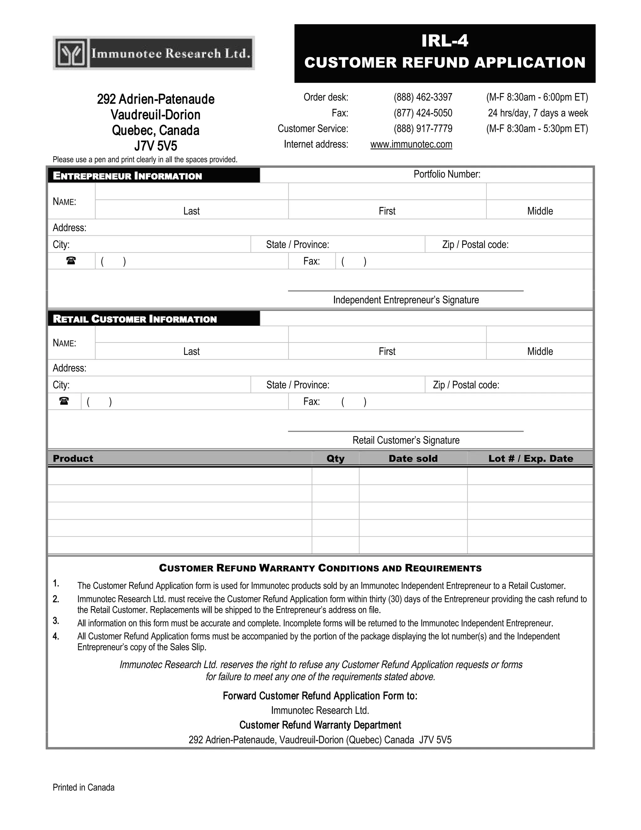 This document is a customer refund application form for Immunotec products. It contains fields for the entrepreneur's and customer's contact information, as well as details of the product being returned such as quantity, date sold, and lot/expiration date. The form notes the conditions and requirements for submitting a customer refund, including that Immunotec must receive the completed form within 30 days of the entrepreneur providing the refund, all information must be accurate and complete, and it must be accompanied by packaging with the lot number and sales slip. Immunotec reserves the right to refuse applications that do not meet these requirements.