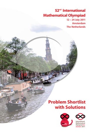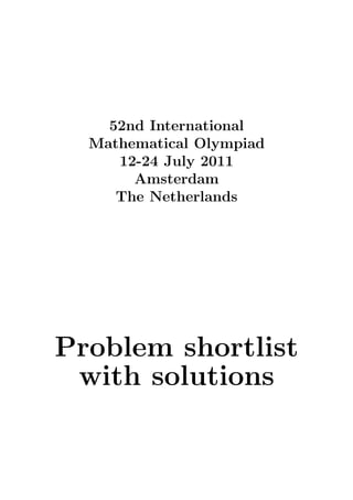 The document describes problems from the 52nd International Mathematical Olympiad held in Amsterdam in 2011. It includes 8 problems in Algebra with solutions and 7 problems each in Combinatorics, Geometry, and Number Theory. The problems cover a range of mathematical topics and skills. The document provides high-level summaries of selected problems along with their full solutions for use in future Olympiads.