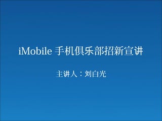 imobile手机俱乐部旨在普及手机相关知识,推广手机文化,并帮助同学更好地融入手机生活。该俱乐部欢迎所有手机爱好者加入,提供学习技巧、资源和培训。招新活动于10月12日至13日在大学生活中心举行,感兴趣者可通过短信报名。