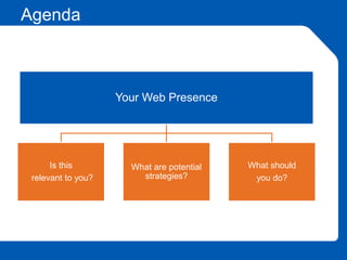 The document outlines the importance of a strong web presence for financial advisors, emphasizing the need to adapt to digital trends and client expectations to enhance relationships and profitability. It provides strategies for improving online visibility, engagement, and overall client experience through effective content marketing, social media use, and personalized communication. Regulatory constraints and common advisor misconceptions about social media usage are also discussed, alongside the potential benefits of a well-structured online presence.