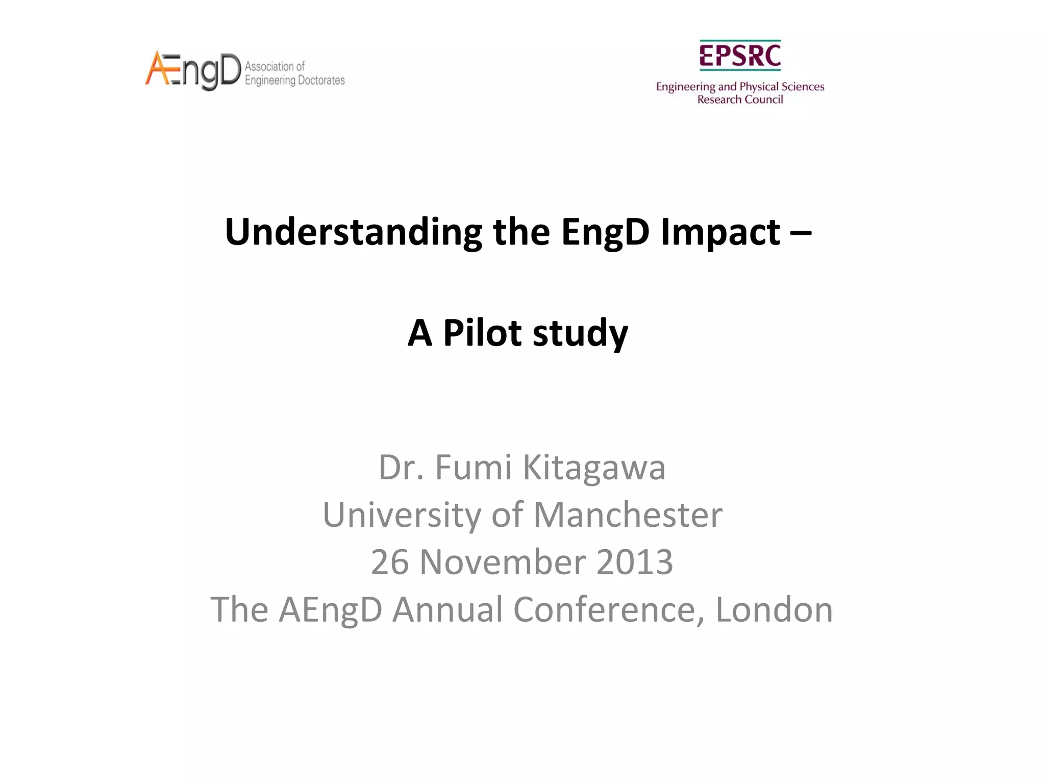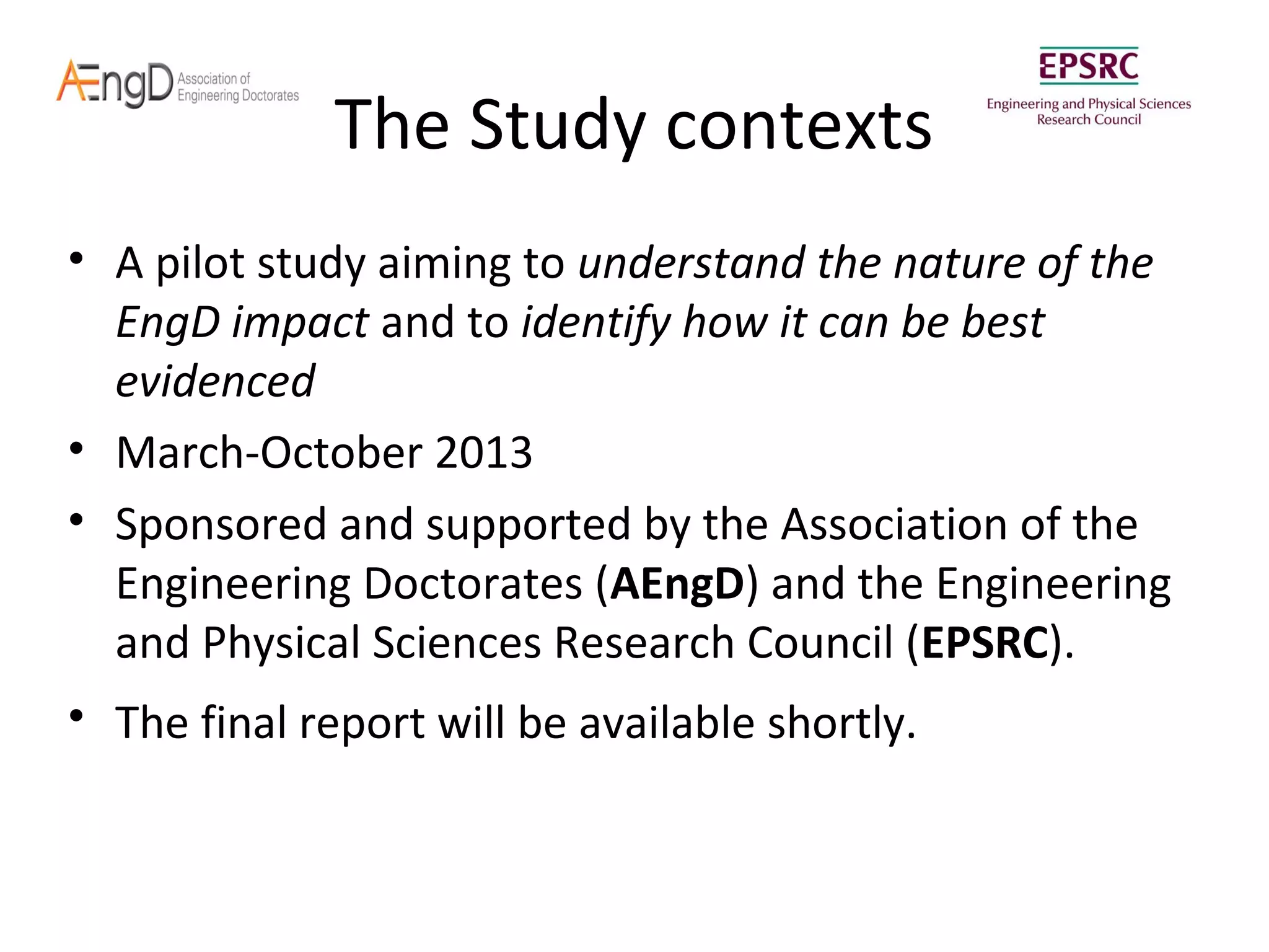 The document summarizes a pilot study on understanding the impact of Engineering Doctorates (EngDs). It found that: