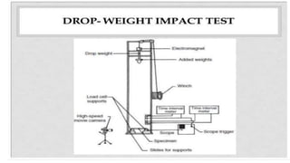 The document discusses various impact and shock testing methods for plastics and metals, including Izod, Charpy, drop weight, and ballistic impact tests. It highlights the importance of testing standards for automotive crashworthiness and the testing procedures for different materials, as well as factors influencing impact force and vehicle design to minimize occupant injury during collisions. Additionally, it covers shock and vibration testing methodologies, detailing the effects of temperature variations and sudden stress on materials.
