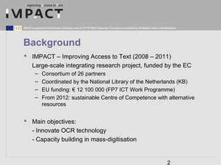 The IMPACT project, coordinated by the National Library of the Netherlands, is a large-scale European initiative aimed at improving text access through advanced OCR technology and mass digitization. Funded by the European Community under the FP7 ICT Work Programme, the project addresses various challenges in document image analysis and leverages a multitude of software toolkits and an interoperability framework. The project's goal is to create a sustainable infrastructure that enhances capabilities for large-scale document processing and facilitates collaborative research.