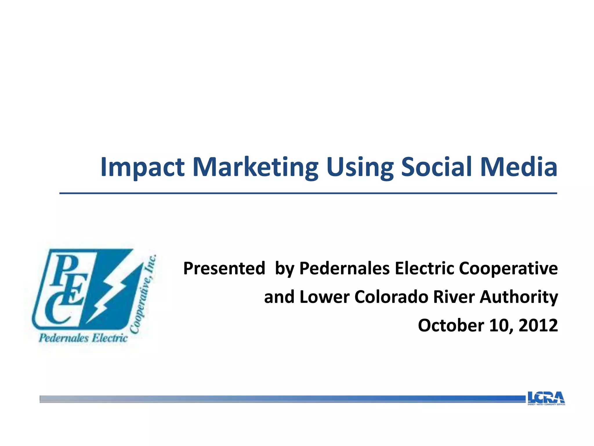 The document presents a marketing strategy using social media by Pedernales Electric Cooperative and the Lower Colorado River Authority. It highlights the benefits of social media, such as brand awareness and audience engagement, and offers tips on audience targeting, content strategy, and platform selection. The presentation also includes examples of effective Facebook and Twitter usage to drive engagement and generate leads.